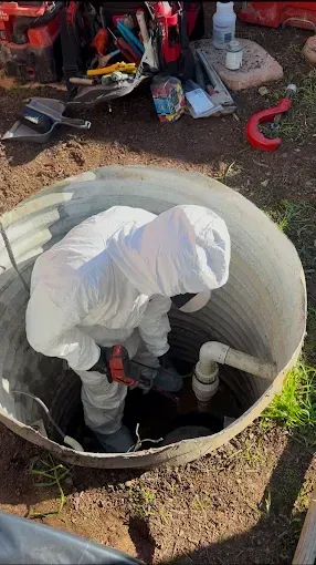 A man in a protective suit is working on a septic tank.