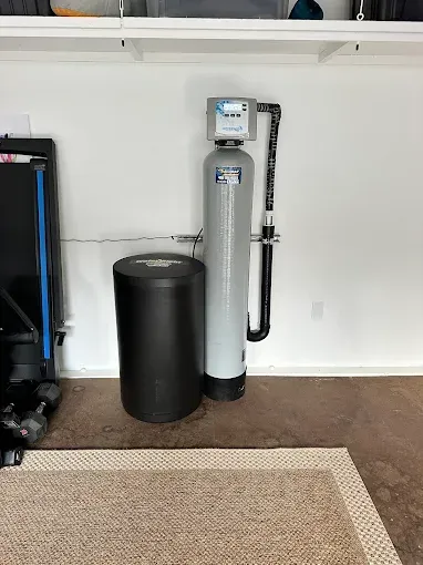 A water filter is sitting in a garage next to a black tank.