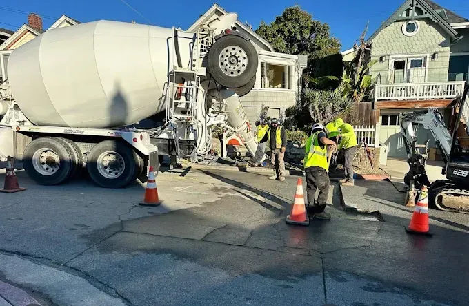 A white truck is parked on the side of the road next to a patch of asphalt.